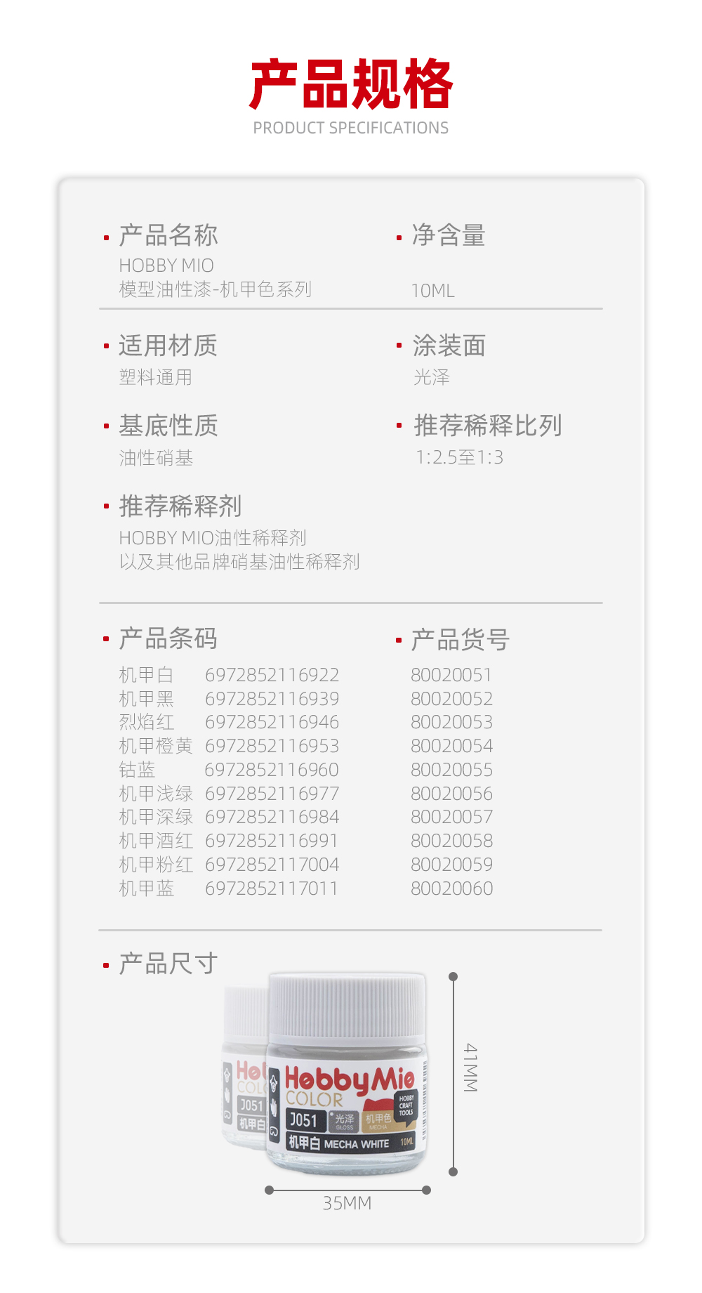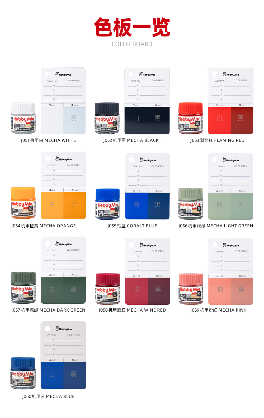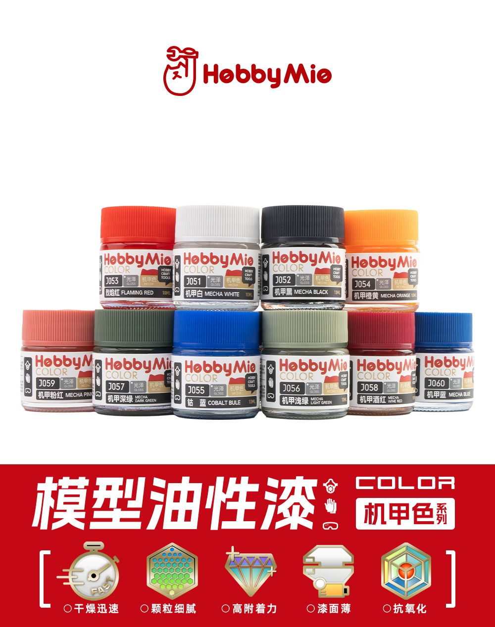 Hobby Mio Gloss Mecha color series Oil paint The oil-based nitro series has fine particles and bright colors. It is a special color number specially adjusted for sci-fi mecha. After drying, the surface can be operated with an oil-based or water-based liner pen. It is not miscible with enamel paint. It can be wiped with X20 solvent. You can use a blue-capped or green-capped water sticker softener. After painting, it supports any brand of water-based or oil-based varnish.